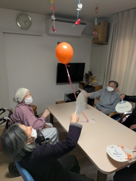 風船にスズランテープを付けてテーブルに固定してうちわで風船をテーブルに落ちないように打ち返すゲームをしました😁