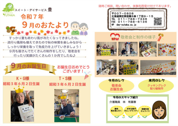 こんにちはデイサービス豊です🍀 最近、風邪が流行してきているようで…インフルエンザも流行を始めているようです😫 体調管理にご注意ください 豊新聞9月号です😆 9月は敬老会があり、楽しい時間を過ごす事ができました💕