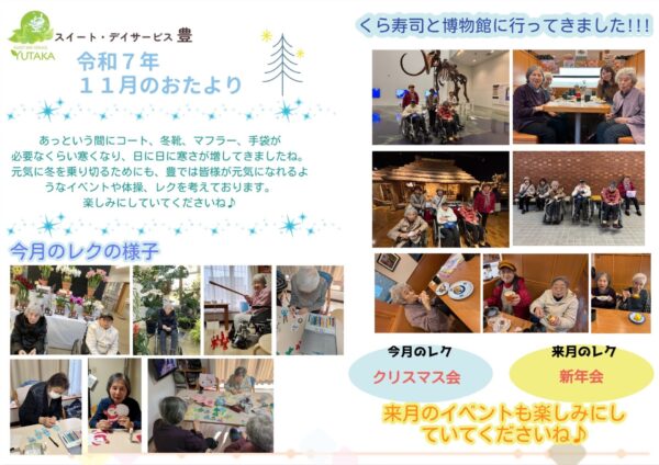 こんにちはデイサービス豊です🍀 豊新聞11月号です😆 11月は外出レクなど楽しく過ごせました😆 ついに本格的な冬を迎えましたね☃️ 足元がツルツルで転倒しやすくなっています😢 外出の際は気を付けて行きましょうね😆